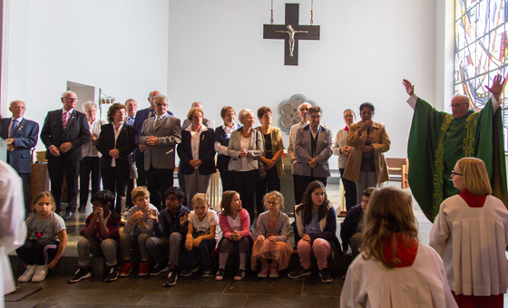 Der Festtag begann mit dem Gottesdienst zelebriert vom Ortspfarrer Blaž Kovač. Besonderer Höhepunkt der Messe waren die Darbietungen des Kirchenchores unter der Leitung von Simon Brüggeshemke und unterstützt von zwei Sopranistinnen und zwei Streichern der Musikhochschule Detmold. Die Gottesdienstbesucher, die Kirche war bis auf den letzten Platz besetzt, bedachten diese musikalischen Leckerbissen (Missa brevis von Haydn) mit lang anhaltendem Beifall. Im Anschluss an die Messfeier wurden die Gründungsjubilare des Kirchenchores Marianne Greve, Gisela Pflug und Barbara Ptatscheck vom Vorsitzenden Karl-Heinz Berlik für ihre 60 Jahre währende Treue geehrt.
