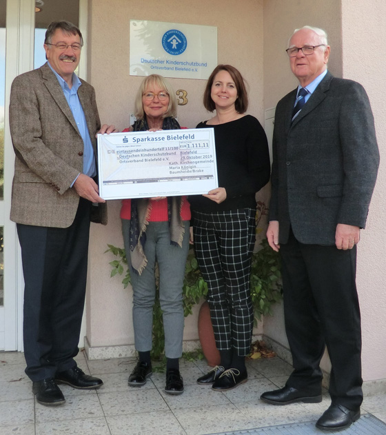 Am Sonntag, dem 15. September 2019, feierte die katholische Gemeinde in Brake das 60-jährige Jubiläum ihrer Hl.-Kreuz-Kirche und des Kirchenchores Cäcilia. Am 29. Oktober 2019 konnten Karl-Heinz Berlik vom Kirchenvorstand und Josef Redeker (Pfarrgemeinderat) dem Ortsverband des Kinderschutzbundes in Bielefeld eine schöne Spende aus den Erlösen des Festes in Höhe von 1.111,11 Euro übergeben.